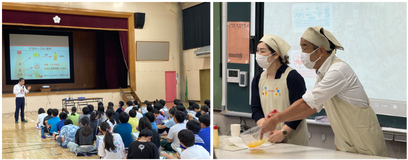 講義は体育館で2クラス合同で実施。まずは、自己紹介を兼ねて子どもたちから事前に届いていた質問に答えました。そして実習では、子どもたちといっしょにマヨネーズを手作り。工場製と食べ比べをしたり、茹でたブロッコリーにつけたりして食べました。