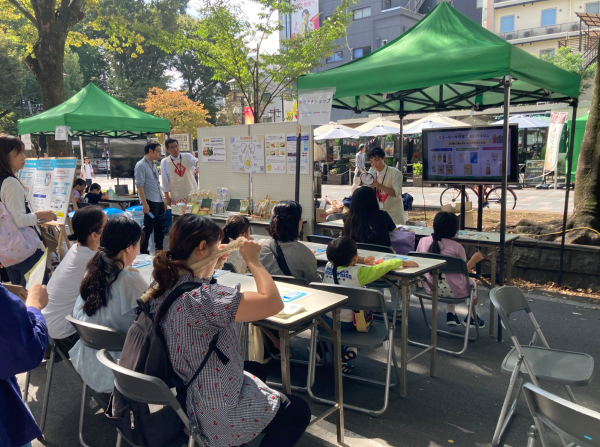 今年の私たちは、「資源循環」をテーマにした展示を行い、キユーピーグループの資源循環に関するさまざまな取り組みの紹介と展示横のテントで「キユーピーさんのSDGsを知ろう」というテーマで講義を実施しました。4回予定した講義は参加希望者が多かったため、急きょ8回に増やしました。