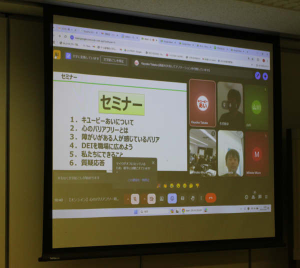 キユーピーあいでは、2024年6月の仙川キユーポート(東京都調布市)への本社移転を機に、グループ従業員の障がいへの理解を深めることを目的とした「心のバリアフリー研修」をスタートさせました。当初は仙川と渋谷の2拠点から始まった取り組みです。