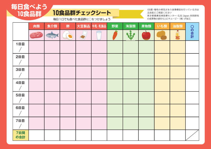 10食品群チェックシートでは、普段の食生活に偏りが多いことが改めてわかりました。完璧な献立ではなくちょい足しでOKとのことでしたので、意識して少しずつ改善していきたいと思います。