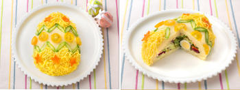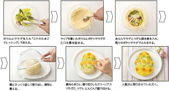 卵に見立てたポテトサラダをカラフルに盛り付け、ポテトサラダの中に隠されたうずらの卵を探します。