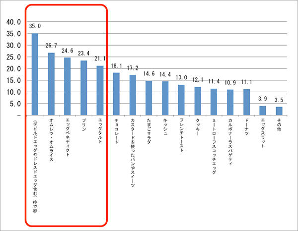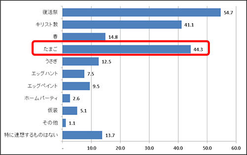 「知っている」「名前だけ聞いたことがある」と回答した人に、イースターと聞いて連想するものを聞いたところ、「復活祭」、「キリスト教」とともに、「たまご」と回答した人が4割を超えました。さらに、イースターに食べたい食べ物を聞いたところ、卵料理が上位を占めており、「イースター=卵料理を食べる」イメージが日本で浸透しはじめていることがうかがえます。