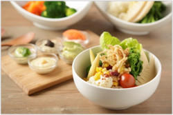 マヨネーズに合う彩りのよい野菜をサラダバー形式で提供します。野菜を5種のカラフルマヨディップ(フムス・バジル・トマト・アボカド・オリーブ)につけて食べます。マヨディップをお好みで混ぜあわせて、オリジナルの味を作るのもおすすめです。