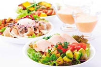 キュウリ・トマト・アボカド・豆などの野菜や半熟風のたまごサラダなどの彩りの良い具材に、チキンを合わせたボリューム感のあるサラダです。