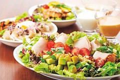 10種類の野菜に、チキンなどの具材をトッピングした主菜になるサラダです。ドレッシングは3種類(すりおろしオニオンドレッシング・レモンクリーミィドレッシング・コブサラダ ドレッシング)からお好みで選べます。