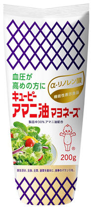 「アマニ油マヨネーズ」は、アマニ油を製品中に30%配合した、卵黄タイプのマヨネーズです。1日の摂取目安量15g(大さじ約1杯)あたり、α-リノレン酸(※1)を2.6g摂取できるように設計しています。パッケージに「本品にはα-リノレン酸が含まれます。α-リノレン酸には血圧が高めの方に適した機能があることが報告されています。」と表示し、血圧が高めの人に向けて訴求していきます。