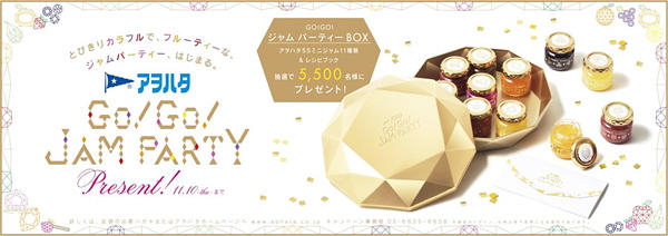 対象商品を購入して、応募いただいた方の中から抽選で5,500名様に「GO! GO! ジャムパーティー BOX」をプレゼントします。クリスタルカットのボックスにはオリジナルパッケージのアヲハタ 55ジャムミニサイズ(約90g)11種類とキャンペーンオリジナルレシピブックが入っています。