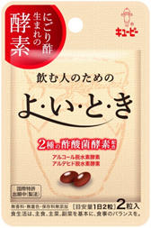 「よ・い・と・き」は、キユーピーグループ独自の醸造技術により世界初の大量生産を実現した、酢酸菌酵素を配合したサプリメントです。酢酸菌酵素には、アルコール脱水素酵素やアルデヒド脱水素酵素が含まれます。おつきあいの多い方や翌日すっきり過ごしたい方などの健康維持をサポートします。