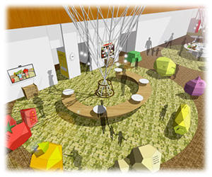 野菜や卵の知識、キユーピーグループの歴史などについて、自由に触りながら遊んで学べる展示スペース。明るい庭をイメージした開放感のある吹き抜けの空間が来場者を出迎えます。展示ゾーンは自由見学方式です。