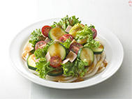 商品と併せて、夏向きでさっぱり食べられる「サラダ麺」(写真㊧)や、秋冬向けの「温サラダ」(写真㊥)など、新たなメニューの提案も継続しています。今期は、麺状にカットした野菜(ベジヌードル)を使ったサラダや主食メニュー(写真㊨)の提案を通して、野菜の新しい食べ方を訴求します。