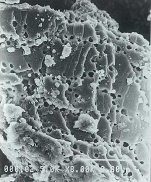 卵殻カルシウム(卵殻由来の炭酸カルシウム)は多孔質な構造をしています。そのため、石灰石由来の炭酸カルシウムと比べて胃の中で溶解しやすく、容易に小腸で吸収されやすい形になります。