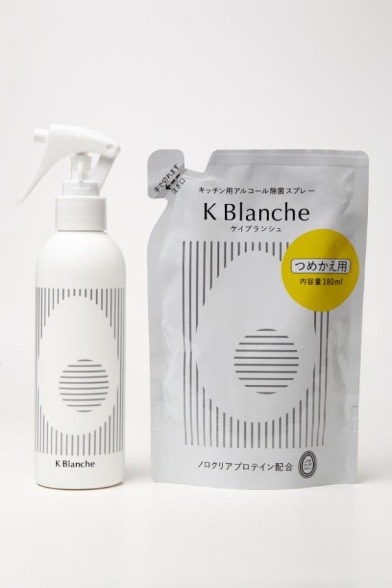 独自開発した卵由来の抗ウイルス成分「ノロクリアプロテイン」を配合したアルコール除菌スプレー「K Blanche(ケイブランシュ)」 要望に応え、詰め替え用を発売