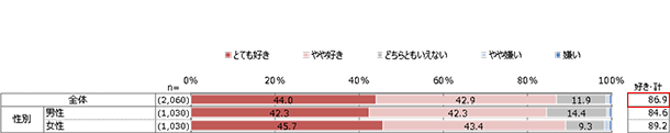 「あなたは卵をどの程度好きですか」という問いに対して、「とても好き」「やや好き」と答えた人の合計は86.9%でした。一方、「嫌い」「やや嫌い」と答えた人の合計は1.2%と低い結果になりました。(資料1)