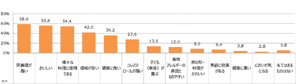 さらに「卵に対するイメージ」についての問い(複数回答)に対して、「栄養価が高い」「おいしい」のほか、「様々な料理に使用できる」と感じる人がそれぞれ5割以上いることがわかりました。その一方で「コレステロールが高い」という回答も27.6%に上り、健康に対するマイナスイメージを持つ人が、未だに一定の割合いるということが明らかになりました。(資料2)