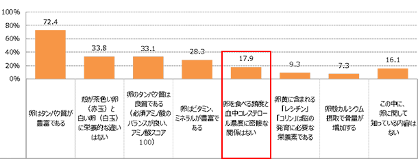 厚生労働省が発表した「日本人の食事摂取基準」(2015年版)では、食事から取るコレステロール量と各種疾病との関連が認められないことから、コレステロールの目標量が撤廃されています。しかし「卵を食べる頻度と血中コレステロール濃度に密接な関係はない」ということを知っている人は17.9%であり、認知がまだ進んでいない状況であることがうかがえます。(資料3)