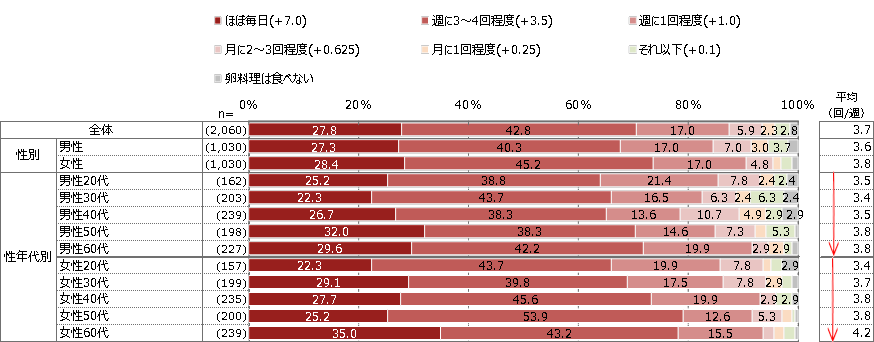 「普段の食事(家での食事、外食などすべて含む)で『卵料理』をどれくらいの頻度で食べていますか」という問いに対して、平均喫食回数は1週間に3.7回、そのうちほぼ毎日食べている人は約3割いることがわかりました。また、男女ともに年代が上がると平均喫食回数が増えている傾向がありました。(資料4)