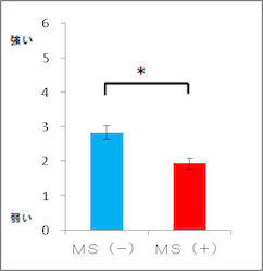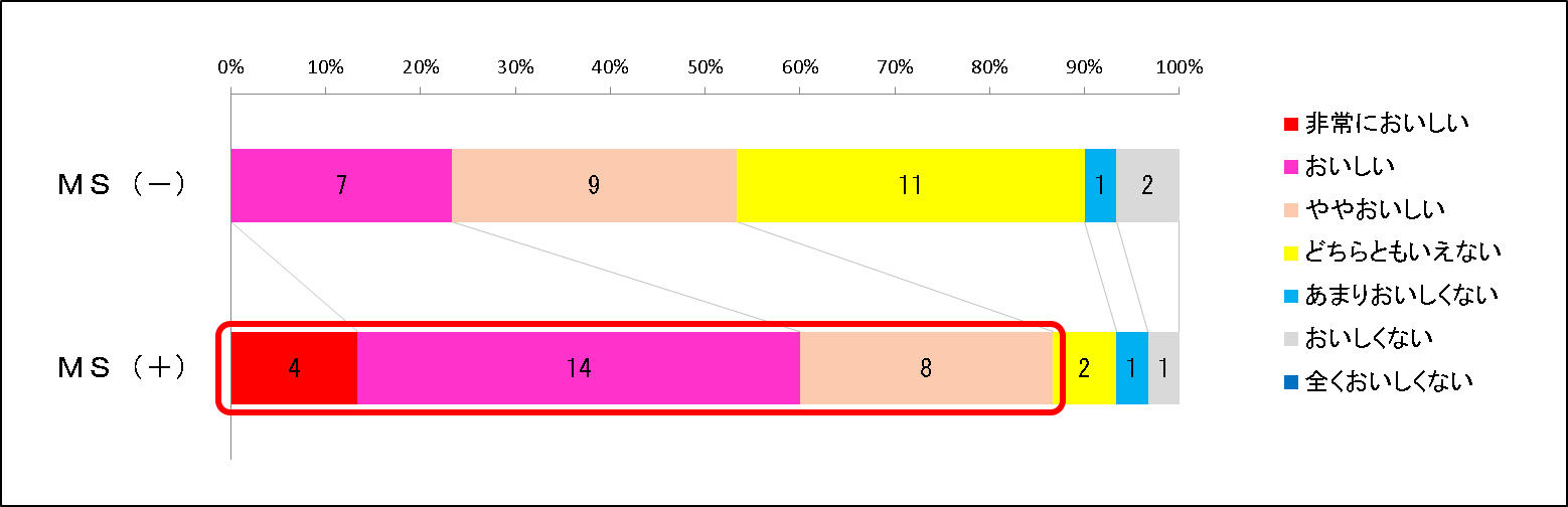 2メニューともに、喫食前・喫食後ともMS(+)群で臭いを感じる程度が有意に低かった(図2、および図3)。また「おいしさ」の評価はMS(+)群で有意に高く、「非常においしい」「おいしい」「ややおいしい」と回答した人は「かじきまぐろのマヨネーズ焼き」では全体の87%、「鶏むね肉のマヨネーズ焼き」は70%だった。(図4、図5)。