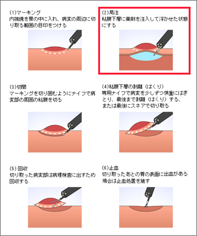 ※2 Endoscopic Mucosal Resectionの略。内視鏡を用いて、スネアと呼ばれる金属の輪を病変部に引っかけ、高周波電流を流して切除する手技。