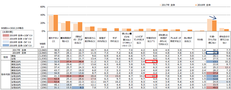 「卵を扱う・使用する際に感じる不満・ストレスは何ですか」という問い(複数回答)に対して、全体をみると「不満・ストレスは感じない」と回答した人が26.8%で、2017年より減少傾向がみられました。また、性年代別にみると、20代の男女ともに「手間がかかること」を選択する人が他の年代に比べて多いことが明らかになりました(資料2)。