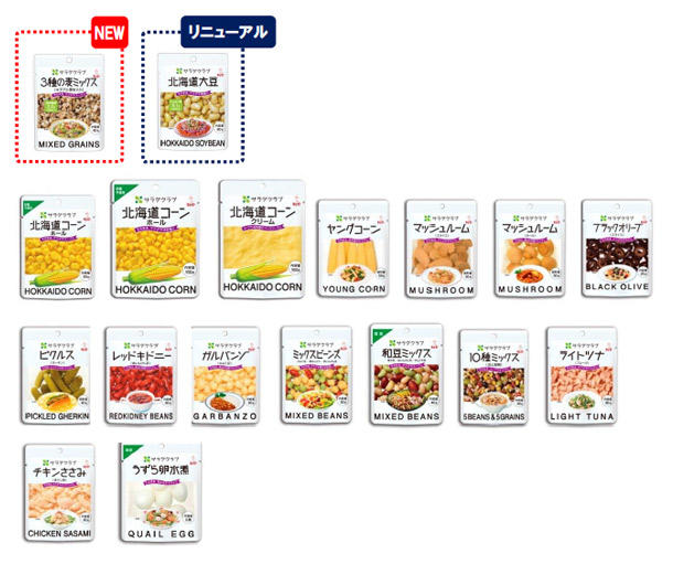 サラダクラブ「素材パウチ」は、袋から出してそのままサラダのトッピングやスープの具材として使用できる、豆や雑穀、オリーブ、ツナなどの素材シリーズです。保存性に優れたパウチタイプで、一食使い切りです。