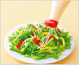 「3つ穴キャップ」とは、キャップを開けると3本の線描き、キャップを外すと星型の絞り口を使える新開発のキャップです。従来のダブルキャップ※の、細口・星型の2通りに絞り出せる機能はそのままに、細口の穴を3つにし、径を小さくすることで、線描きの楽しさをさらに向上させました(写真左下)。サラダのほか、お好み焼きやパン、丼などにまんべんなく線描きすることで、料理を見映えよく演出できます。