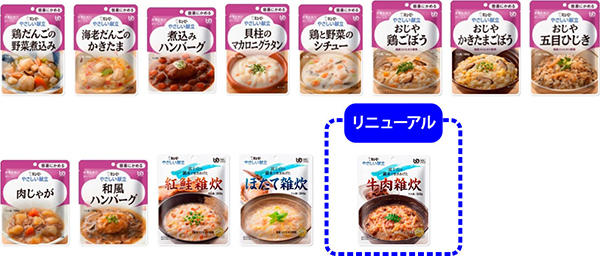 厚生労働省の調査では、在宅介護を受ける高齢者の6割以上が低栄養状態の傾向があります。要因の1つとしてかむ力や飲み込む力が弱くなったことが挙げられます。肉は要介護者には硬く、かみにくい食材です。そこで食べやすいようにやわらかく加工した肉を使用した「やわらかおじや 牛丼風」「やわらかおかず かつ煮味」「やわらかおかず 豚汁」の3品を追加します。いずれもやさしい塩加減で素材のうま味を感じられるよう仕立てました。