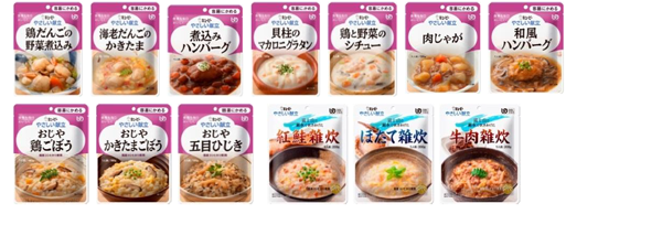 「やさしい献立」は、かむ力や飲み込む力に応じた食べやすさ(容易にかめる・歯ぐきでつぶせる・舌でつぶせる・かまなくてよい・とろみ調整)に区分したユニバーサルデザインフード(UDF)です。“かまなくてよい”は、固形物は小さくても食べづらい人に合わせた、なめらかなペースト状の食品です。