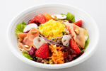 7種類の葉物野菜に、マッシュルーム、にんじんやビーツのサラダを合わせ、ふわふわのスクランブルエッグや生ハム、いちごを盛り付けました。