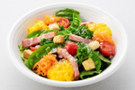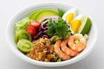 7種類の葉物野菜、アボカドや2色のトマトに、ゆで卵とえびを合わせました。黒酢たまねぎドレッシングで味付けしたキャベツライスも加え、食べ応えのある一皿に仕上げました。