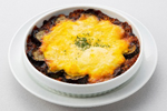 キャベツライスをお米の代わりに使ったドリア風です。キャベツライスに、ミートソース、豆や雑穀を混ぜ合わせて、なすと卵、チーズをのせて焼き上げました。