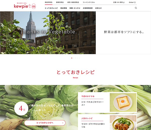 「企業サイト」では、理念やめざす姿をベースにした、キユーピーグループの想いや活動を発信していきます。また、英語サイトを大幅に拡充し、より世界に情報が伝わるようにしました。「商品サイト」では、旬の野菜を使ったレシピなど、タイムリーな情報を伝えることで、何度も訪れる楽しみのあるサイトをめざしました。