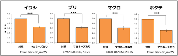 イワシ、ブリ、マグロ、ホタテのいずれの寿司も、マヨネーズの添加により有意に生臭さが低減した。