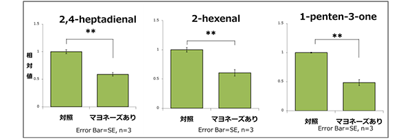 マヨネーズを加えていない対照と比較して、マヨネーズを加えたサンプルでは、有意ににおい成分が低減した。