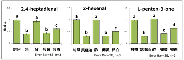 無添加の対照と比べて、菜種油・卵黄・卵白の添加では、におい成分が有意に低減した。その効果は、卵白よりも卵黄・菜種油で大きかった。
