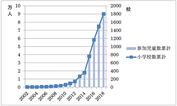 グラフ:2002年から2018年までの年間参加児童数と開催小学校数の累計