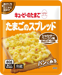 「たまごのスプレッド」シリーズは、パウチに入ったチルドのパン専用卵スプレッドです。新商品は、食感がよく、朝食のメニューとして人気が高いショルダーベーコンと、ゆで卵をチーズ風味のソースで混ぜ合わせました。ゆで卵の固形感やソースの量を調製することで、パンに塗りやすくしています。また、パウチのシール形状を工夫し、スプーンを使わなくてもパウチの細口から直接パンに出せるようにしました。食パンやバターロールなどで、自分好みのメニューを手軽に楽しめます。