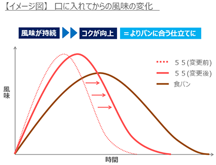 55ジャムでは2005年から「香り戻し技術※」を採用しています。今回のリニューアルでは、フルーツをジャムにしたときに感じられる、フルーツ本来の甘い香りがより感じられるよう、それぞれのフルーツに合わせてジャムの中に戻す香りを見直しました。これにより風味が持続し、コクが感じられる、より食パンに合う仕立てになりました。