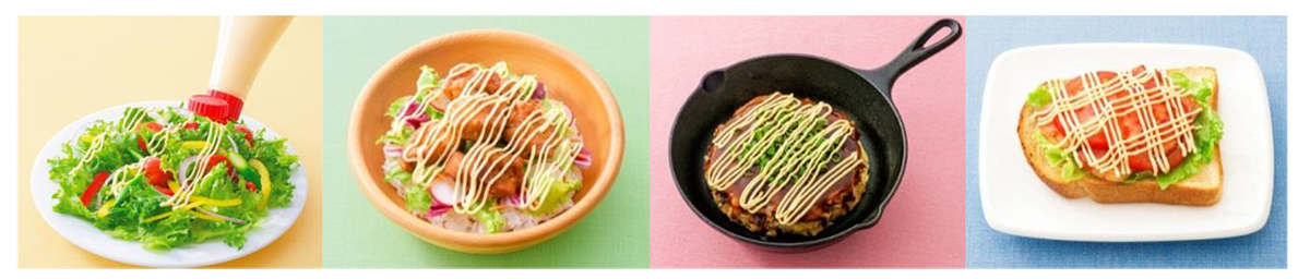 「3つ穴キャップ」とは、キャップを開けると3本の線描き、キャップを外すと星型の絞り口として使える2018年8月に採用したキャップです。従来のダブルキャップ※の、細口・星型の2通りに絞り出せる機能はそのままに、細口の穴を3つにし、径を小さくすることで、線描きの楽しさをさらに向上させました。サラダのほか、お好み焼きやパン、丼などにまんべんなく線描きすることで、料理を見栄えよく演出できます。