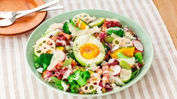 キユーピーは、2019年に設定した「サステナビリティ目標」の中で、サラダとタマゴのリーディングカンパニーとして「健康寿命延伸への貢献」を掲げています。具体的には、1日当たりの野菜摂取量の目標値350g※3の達成に貢献すること、たんぱく質摂取のために卵の消費量アップを推進することを目標としています。