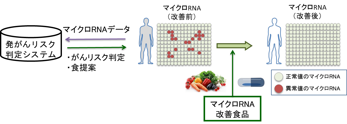 これは、①血液中に存在するマイクロRNAという微量成分の発現量により将来の発がんリスクを判定する研究と、②がん予防の観点から、特定の食成分の摂取によるマイクロRNA発現量の改善に関する研究です。