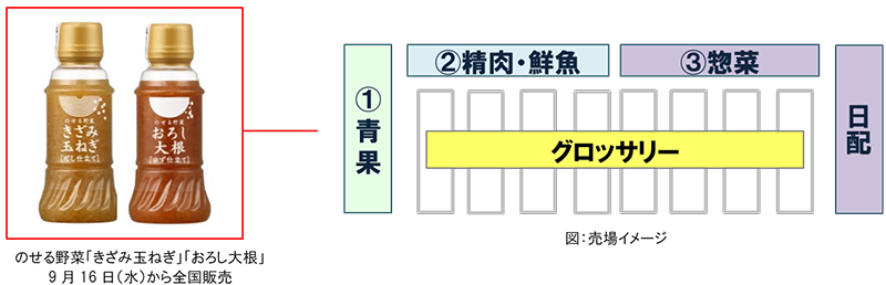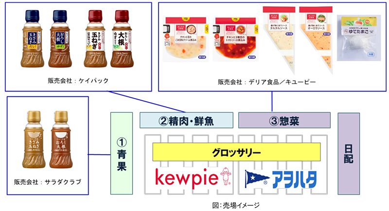 「フレッシュストック™」事業の新商品の第一弾は、グループ各社が販売し、キユーピーが企画開発します。調味料、パッケージ惣菜、たまご商品の3つの柱を①青果売場、②精肉・鮮魚売場、③惣菜売場の3つの売場で展開します。まずは、①の青果売場用調味料2品を9月16日(水)からキユーピーグループの株式会社サラダクラブ(本社:東京都調布市、代表取締役社長:金子 俊浩)が全国販売を開始※します。②精肉・鮮魚売場、③惣菜売場についても、今秋からテスト的に市場に商品を順次投入していきます。