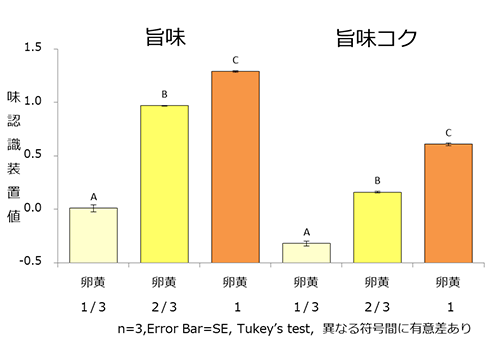 マヨネーズの風味強化の要因を探るため、卵黄の量を変えたマヨネーズを味認識装置で分析した結果、卵黄の量が多いほどうま味とコクが増大しました。これは、官能評価、香気分析でも同様の傾向となりました。