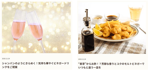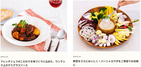 2020年12月24日第1弾として「ビネガーマルシェ」「ソースマルシェ」をオープンします。商品一覧、特集、レシピの掲載とともに、すぐに購入できるよう外部ECサイトのURLを記載しています。