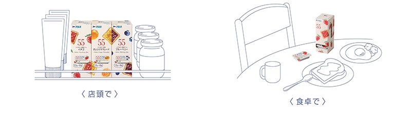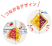 店頭で販売する面は、ポーションであること、8個入りであることなどの商品情報を盛り込み、3品並べると食パンの絵がつながるようにデザインしました。食卓で使用する面は文字情報を減らし、食卓になじむシンプルなデザインにしています。