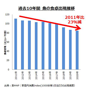 魚料理の食卓出現頻度は年々減少傾向です。その理由として、「下処理の手間や難しさ」「メニューバリエーションの少なさ」「ボリューム感を出しにくい」「後片付けが面倒」などが考えられます。