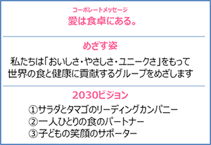 キユーピーグループはコーポレートメッセージ「愛は食卓にある。」に込めた想いのもと、サラダとタマゴを中心に、「おいしさ・やさしさ・ユニークさ」をもって世界の食と健康に貢献することをめざしています。この「めざす姿」を実現するため、2030年に“どうありたいか”を表した「キユーピーグループ2030 ビジョン」では、①サラダとタマゴのリーディングカンパニー、②一人ひとりの食のパートナー、③子どもの笑顔のサポーター、の3つの視点を掲げています。