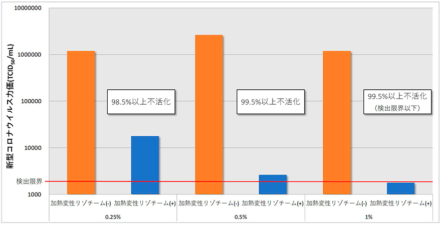 【グラフ2】0.25~1%の加熱変性リゾチームと5分間反応させた新型コロナウイルスの力価