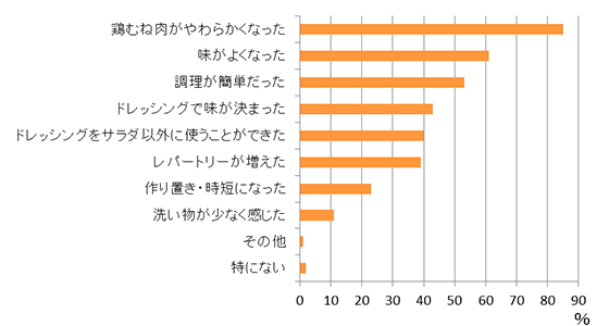 ・鶏むね肉をドレッシングで漬け込んでよかった理由は、「鶏むね肉がやわらかくなった」「味がよくなった」「調理が簡単だった」という回答が多かった。