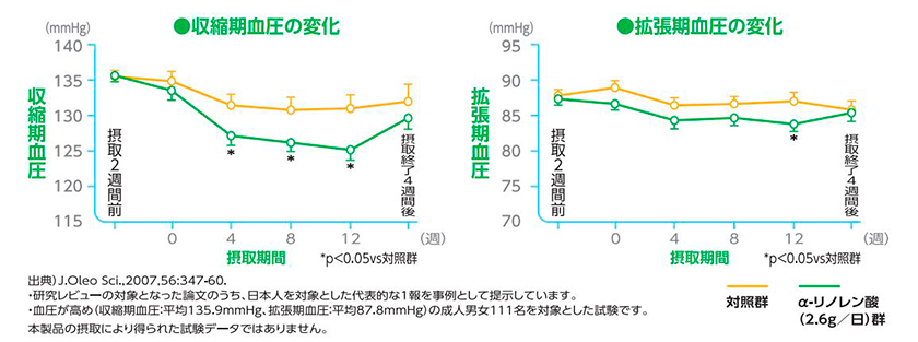 ※2 α-リノレン酸は、体内では作ることができず、食事から摂取することが必要な「必須脂肪酸」です。臨床試験では、血圧が高めの方がα-リノレン酸を1日あたり2.6g摂取すると血圧が正常値まで低下したという結果が得られています。(J. Oleo Sci., 2007, 56:347-60.)