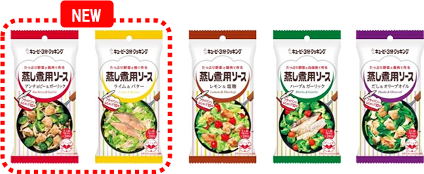 「蒸し煮用ソース」は、フライパンで10分蒸すだけで簡単に野菜たっぷりのおかずが作れる調理ソースです。素材の味を生かすシンプルな味付けで、いろいろな食材の組み合わせが楽しめます。